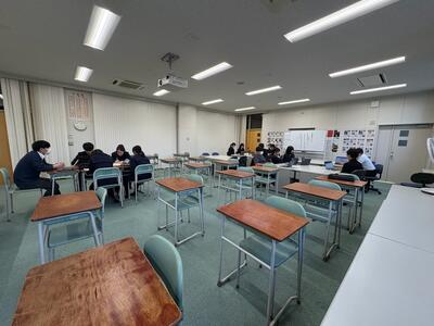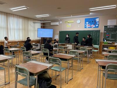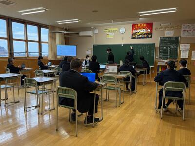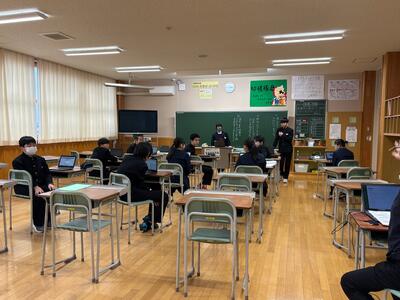昨日、乙部町教育委員会から教育長様、教育長職務代理者様、教育委員の方2名、事務局長様、学校教育指導主事様にお越しいただきました。いつも学校生活の様子を気にかけてくださり、ありがたく思っております。授業では、1年生は道徳で、A組は、自主 自律 自由と責任を扱った題材で「自分と向き合い自分の中にぶれない軸を持つ」をテーマにロイロノートを使って意見交流をしていました。B組は、相互理解 寛容を扱った題材で「お互いの立場の理解」について自分の考えを発表していました。