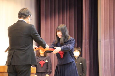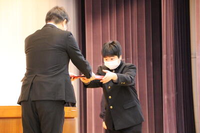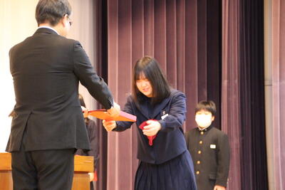 本校では、表彰後に生徒から一言もらいます。「次の機会があればまた頑張りたい」「挑戦することで考える機会になった」「みんなの意見が尊重されたらいい」という感想がとても立派でした!