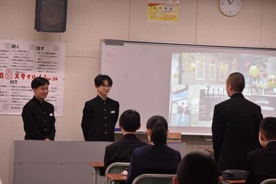2年生は昨日、1年生に向けて標記の発表会を行いました。スライドをCanvaで作成し、わかりやすくプレゼンテーションをし、1年生からの質問にもしっかり回答していました。2年生が、勉強になったところなど各事業所の特徴を詳しく説明することによって、1年生は来年度の職場体験学習に見通しをもつことができました。