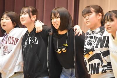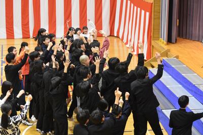 【3年生の出し物:ダンス アンコールのジャンボリーミッキーで全校生徒がステージへ】