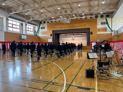 式当日は風が強く、小雪が舞う肌寒い天候となりましたが、卒業式は落ち着いた雰囲気の中滞りなく行うことができました。卒業生の入場する姿、証書を受け取る姿、とても立派でした。在校生からの歌、祝福の気持ちがこもった素敵な歌声でした。全校生徒素晴らしかったです。