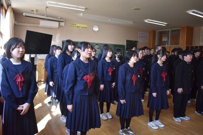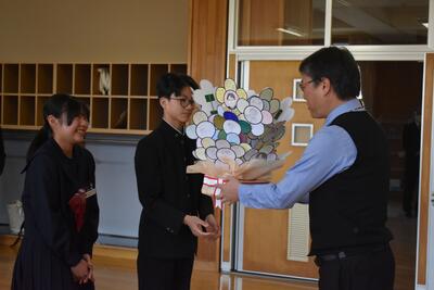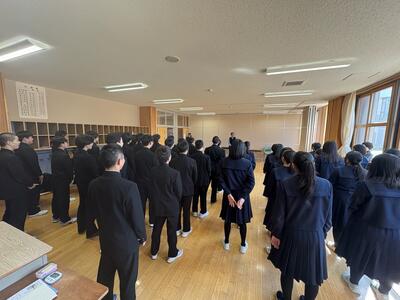 校長先生へサプライズ 投稿: ICT (03/26) 久しぶりに3年生が登校し、令和7年度の離任式を行いました。全て終わった後に、全校生徒が校長先生のために「旅立ちの日に」を歌う場面がありました。まるで家族のようなチーム感で今年度が終わりました。修了式・離任式の様子は明日アップします。 -